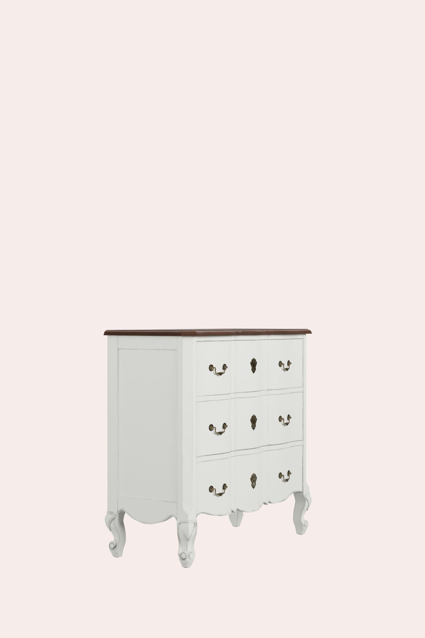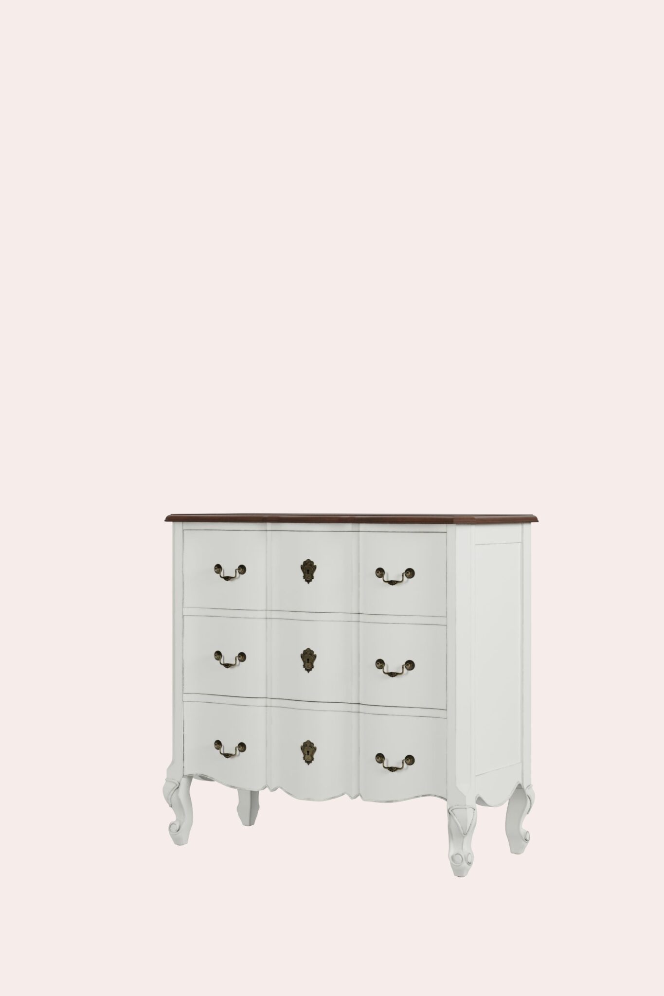 Møbelserien Montpellier sin elegante kommode er laget i massivt tre med en overflate malt i vakker elfenbensfarge. Kommoden har vakre antikke messingbeslag på skuffefronter, detaljer i klassisk stil som cabriole ben – og med sine kurvede og håndskårne detaljer skaper møbelet den nostalgiske og tidløse franske landstilen. Kommoden som vil være et smykke i ethvert rom har 3 romslige skuffer som gir rikelig med lagringsplass.
