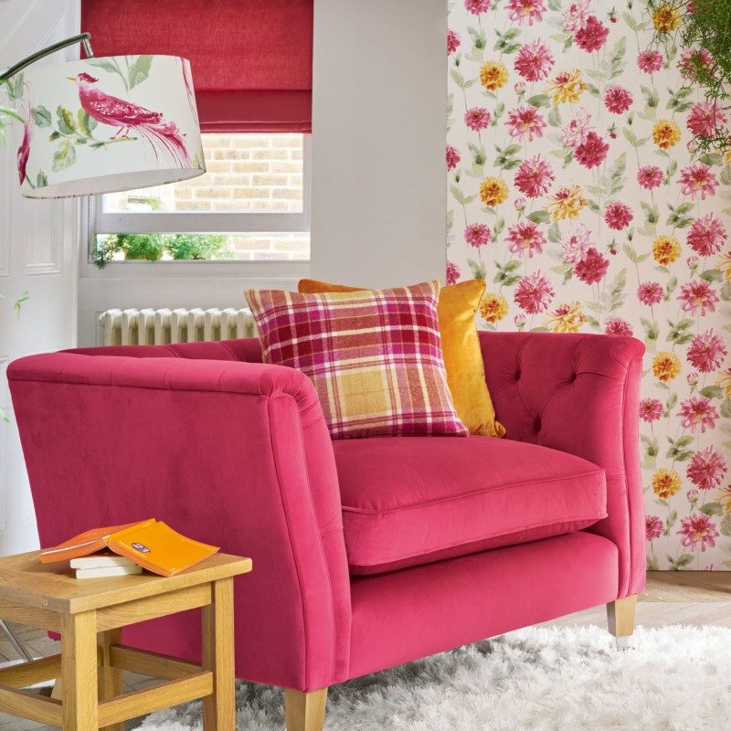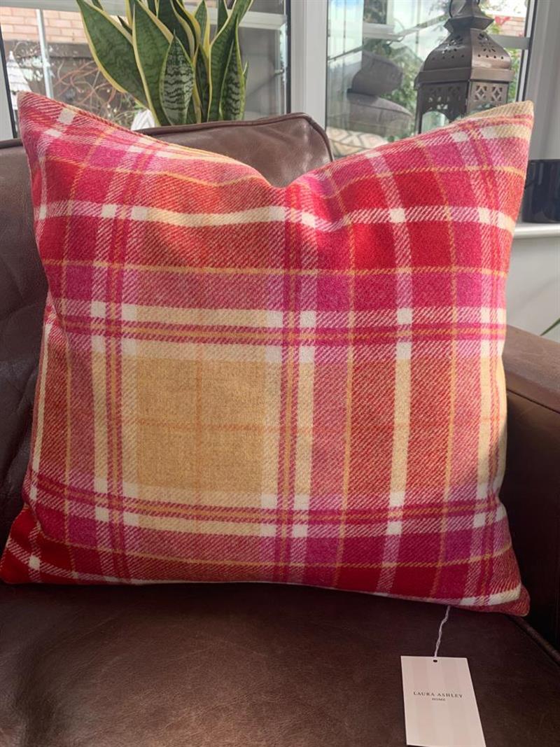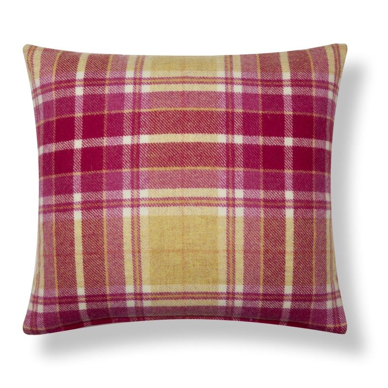 En fargerik og fargeglad tartanrutet ullpute i grapefruktrosa og gult, det er en sjarmerende fargeklatt som man bare blir i godt humør av.