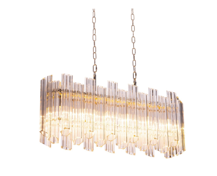Den langstrakte formen gjør lysekronen ideell over spisebord eller kjøkkenøy, hvor den både gir godt lys og fungerer som et naturlig midtpunkt i rommet. Nasser i denne utførelsen kombinerer moderne eleganse med tidløs luksus – en lysekrone som setter stemningen og fullfører helheten.