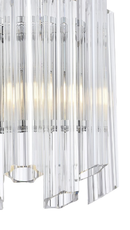 Den polerte nikkelrammen gir et klassisk og sofistikert preg, mens de klare krystallstavene tilfører lys, dybde og et eksklusivt uttrykk. Når lampen tennes, brytes lyset vakkert i krystallene og skaper et levende, skimrende spill som gir veggen et dekorativt og luksuriøst preg.