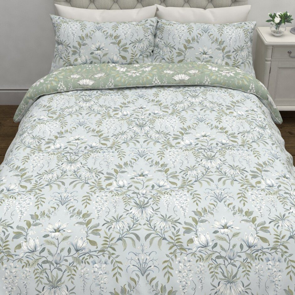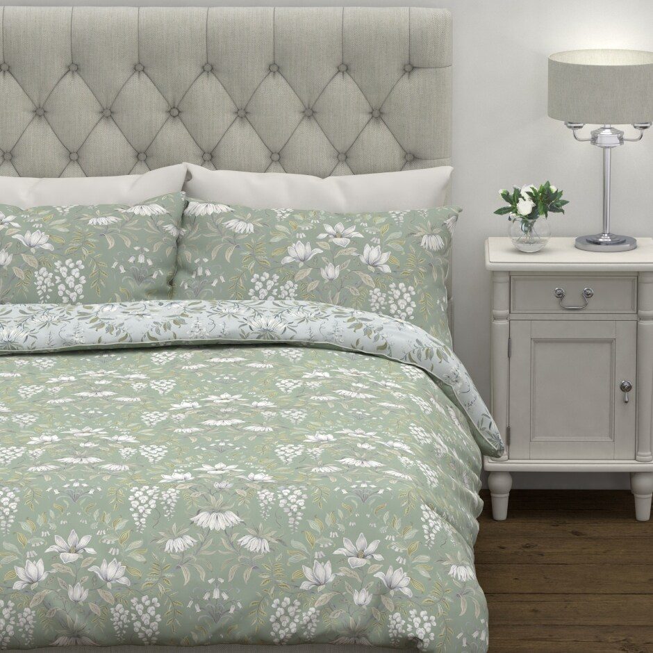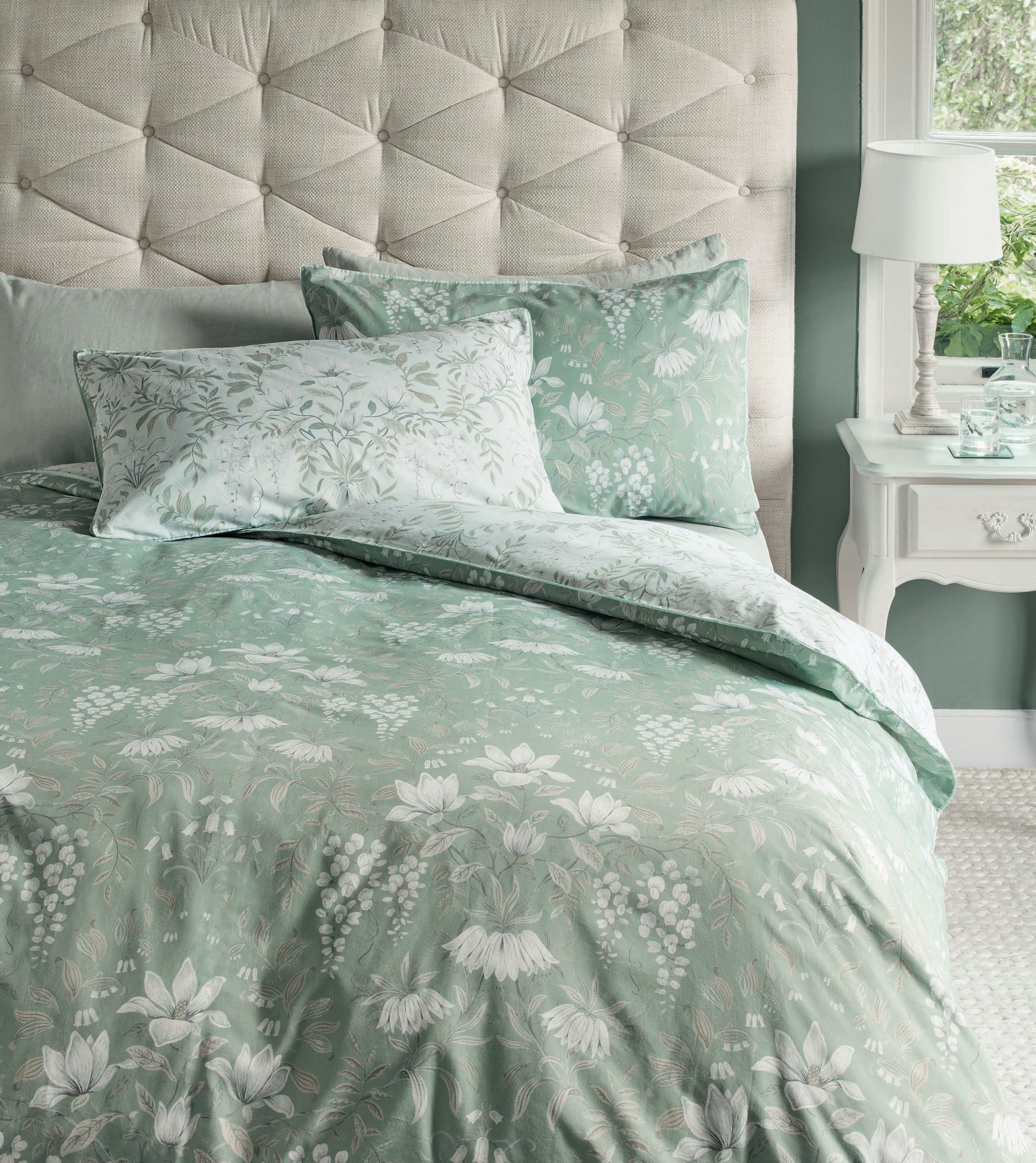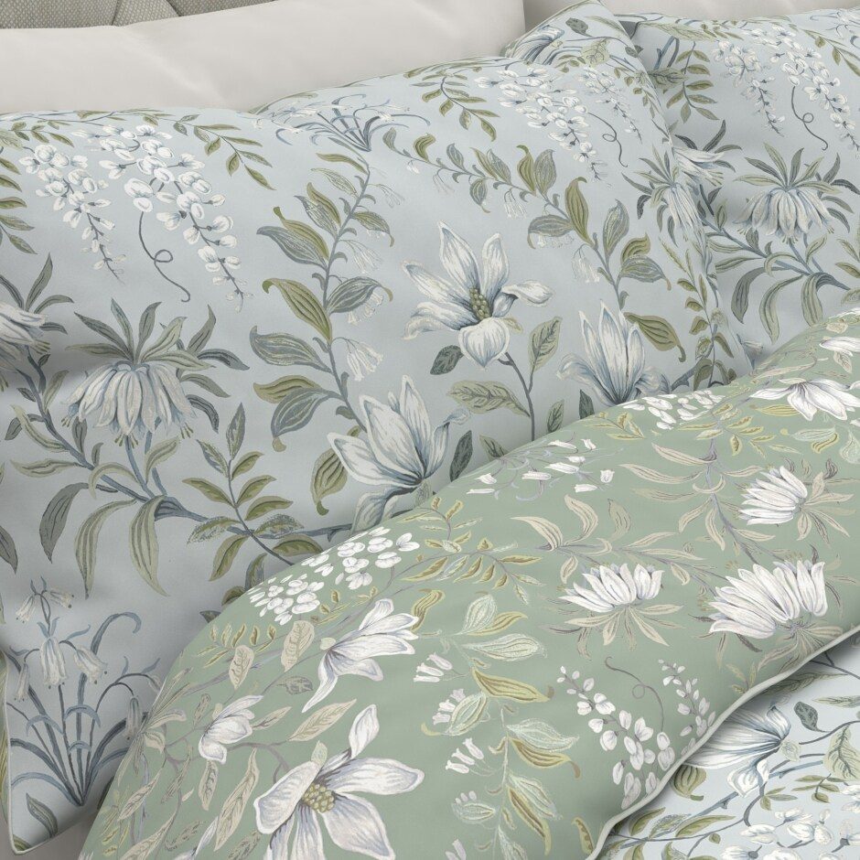 Parterre is a beautiful and sophisticated floral design featuring printed white flowers and swirling patterns of leaves. In our sage hue this design brings a modern feel to a vintage-style pattern, and this bedset is pure cotton for breathable comfort every night.