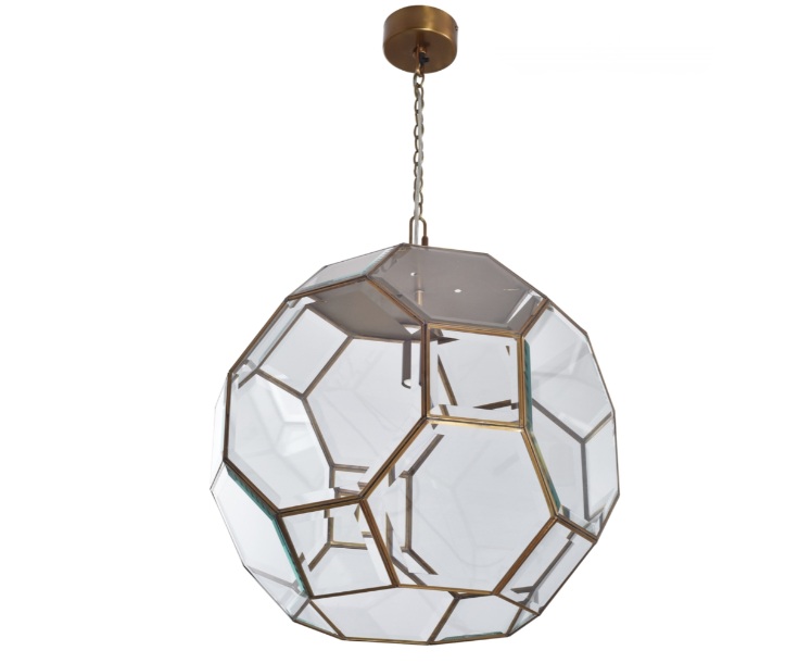 Vår Patroclus Stor Pendellampe er en slående geometrisk lampe med ikonisk ikosaeder form, produsert med en antikk messingramme og klare glasspaneler som lar lyset skinne gjennom og skaper vakre mønstre og en varm, innbydende glød.