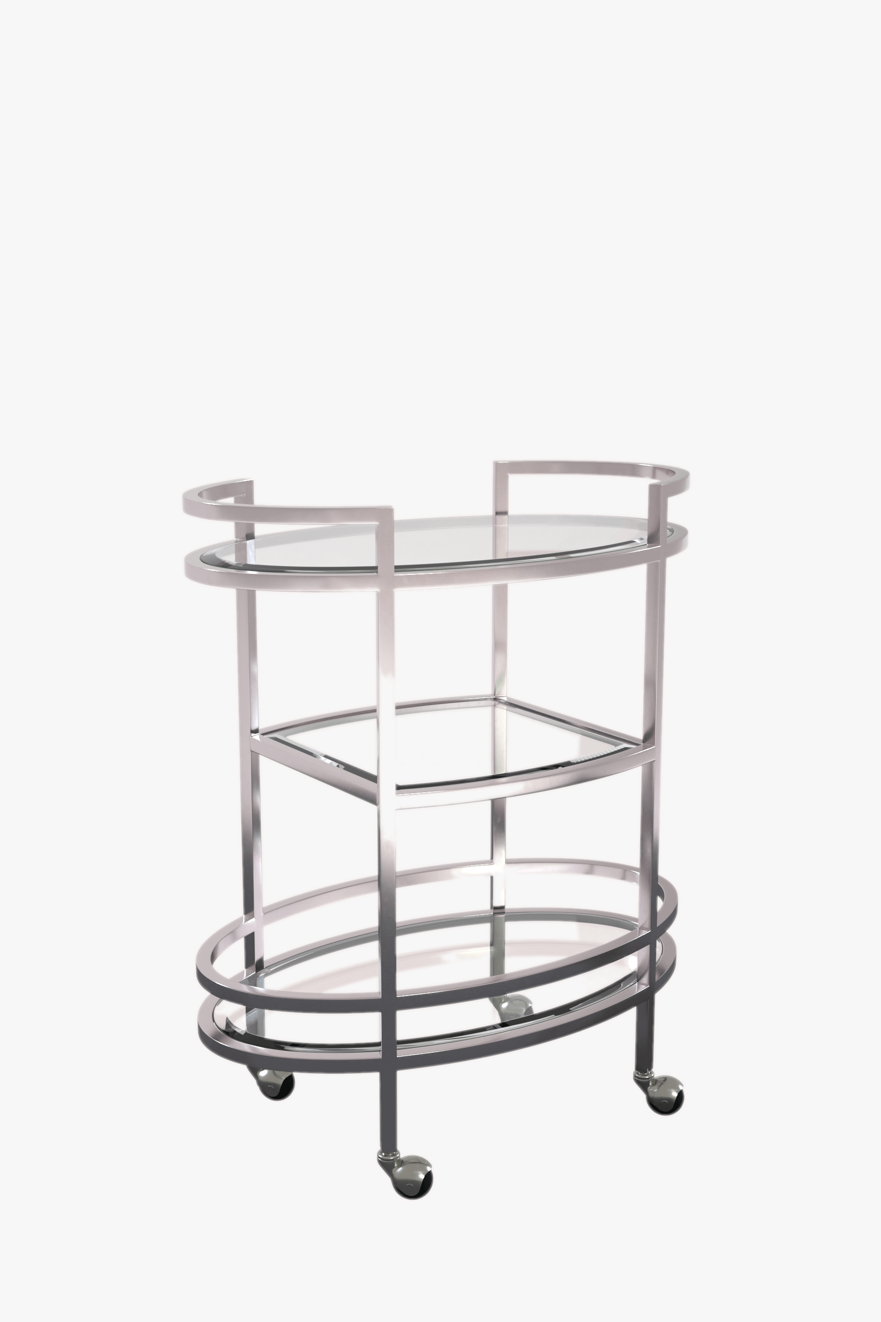 Den lekre og tidløse Pendine møbelserien i glass og stål fra Laura Ashley. Her en elegant cocktail tralle, i art deco stil i stål med slepet glass. Lekre kurver og smart design med hyller, gjør den til et elegant tilskudd til rommet, perfekt for flasker og glass, eller som et sidebord.
