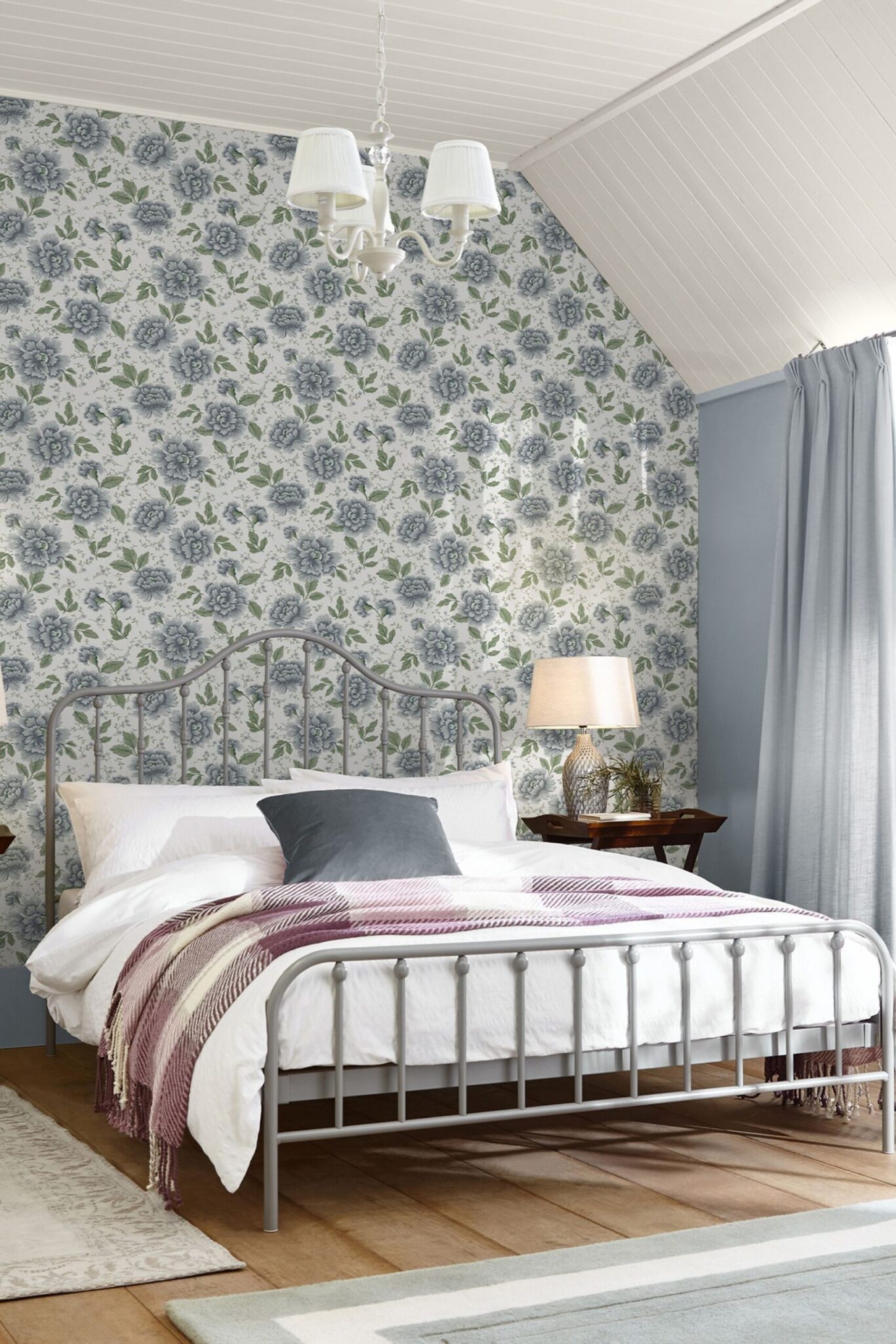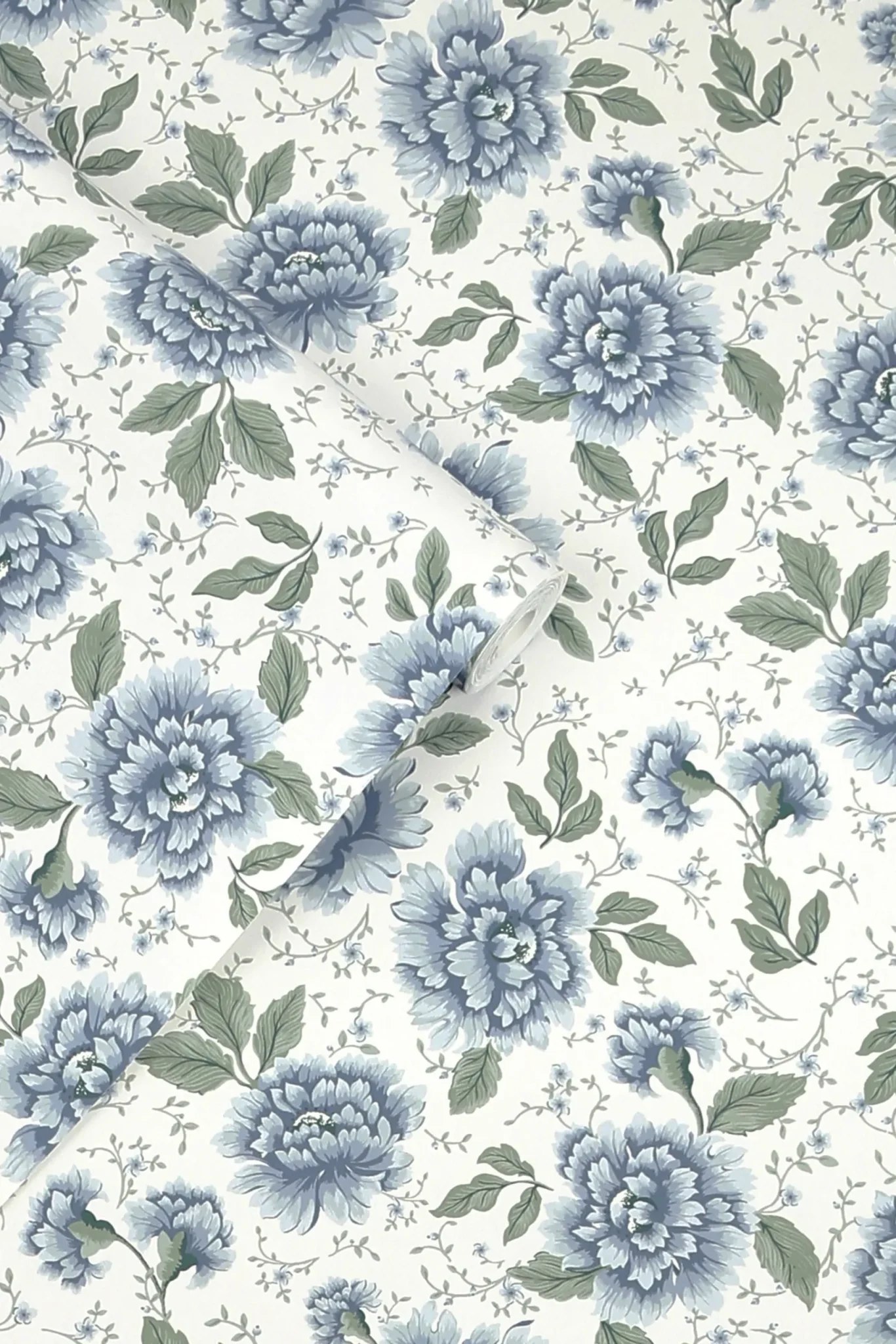 Pickworth Posy, en tidløs og elegant blomstertapet i blått fra Laura Ashley. Designet med et malt trykk med peoner, nelliker og løvverk i bakgrunnen.