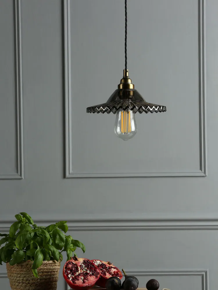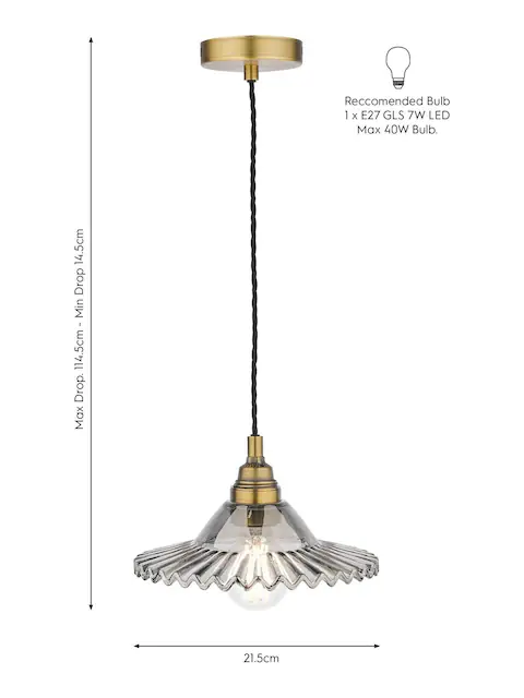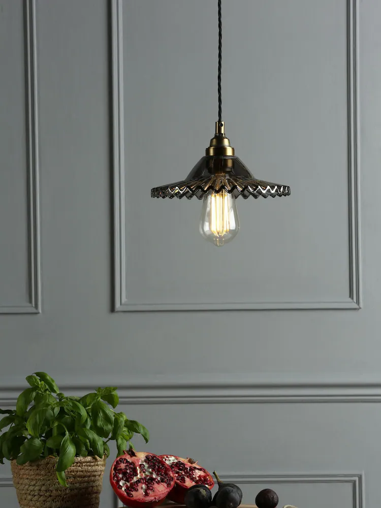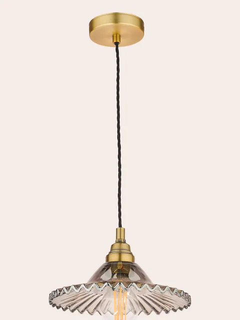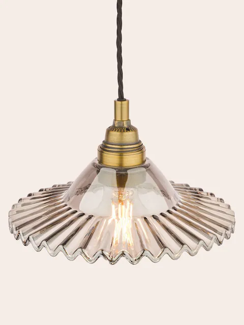 Tenk deg vintage gårdshus møte med urbant kjøkken! Med pene, rysjede kanter som et ballerinas tyllskjørt er den lille Pippa-taklampen fra Laura Ashley en fryd. Pippa minner også om bølgene på en muslingeskjell- eller paideig, er i røkt glass og er kombinert med armaturer i gammel messing og en matchende flat, rund takroset. Denne sjarmerende pendelskjermen vil passe i et mindre rom; plasser den strategisk over et arbeidsområde, eller du kan arrangere flere på rad eller forskjøvet i en klynge over en kjøkkenøy. Ved montering kan du justere lengden på det tvinnede, svarte flettede stoffet med fleksibel funksjon for å endre høyden slik at det passer til rommet ditt (14,5–115 cm); den er egnet for lavere tak og mindre rom.