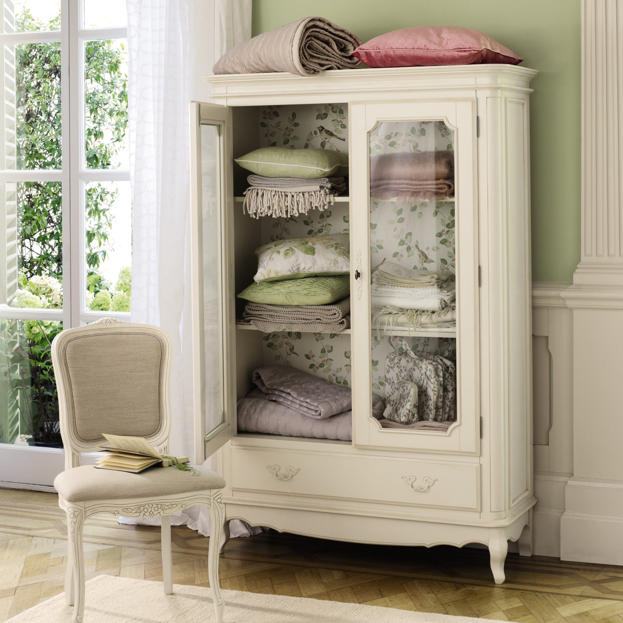 Et vakkert midtpunkt for enten soverommet eller stuen, Laura Ashley Provencale 2 Door 1 Drawer Armoire er definisjonen på praktisk sofistikert. To justerbare hyller er lukket bak glassdører med espagnolettlås. I tillegg er en skuff i full bredde kledd med autentiske floride håndtak som er spesielt tilpasset stilen. De typiske buede hjørnene på møblet kompletteres ytterligere av dens høye og utsmykkede gesims. Alle overflater er avsluttet med en slitesterk, men upretensiøs maling og en delikat påført patina til utvalgte kanter og profiler. Bare bena må festes for å begynne å nyte dette møblet, full montering er ikke nødvendig.