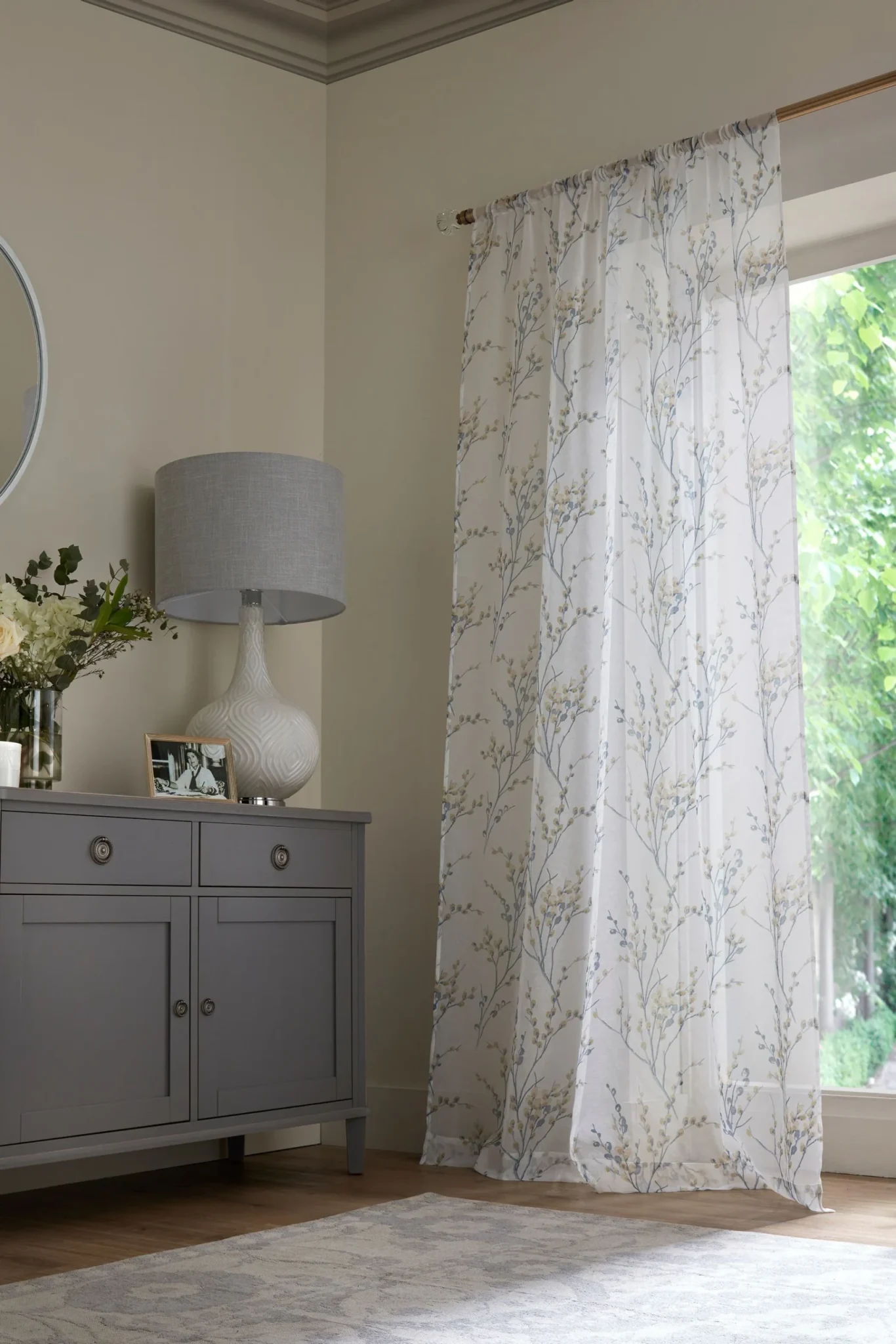 Florlette og elegante voilgardiner fra Laura Ashley. Gardinene med det vakre og tidløse designet med gåsunger, Pussy Willow. Et subtilt og elegant design i lekker blått. En gardin som vil bringe naturen subtilt inn i hjemmet.