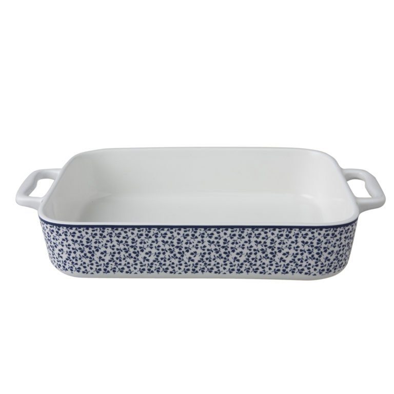 Praktisk og elegant rektangulær ovnfast form i porselen, i «Blueprint Collectables» serviset, her i mønsteret «Floris» i blått og hvitt.