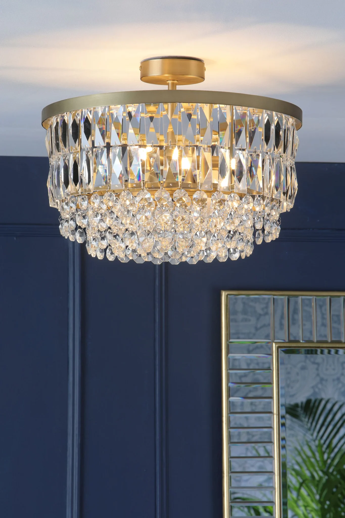 Rhosill, er en slående vakker taklampe, i matt børstet messing med slepne glasskrystaller gir den et elegant uttrykk til rommet. The Rhosill Semi Flush light Laura Ashley features stunning facetted glass crystals with a gorgeous matt antique brass-effect metal accents. Semi flush fittings are suitable for low ceilings and small rooms, plus they have a neat finish with no visible cables. This statement ceiling light would complement any room.