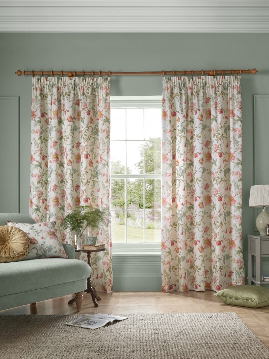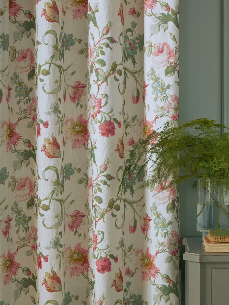 Rosalind, et mønster fra Laura Ashley sine arkiver, med et romantisk og tidløst blomsterdesign. Her trykket på bomull/lin i en delikat fargeskala med rødtoner. Gardiner som bringer sjarmen til en engelsk hage inn i hjemmet.