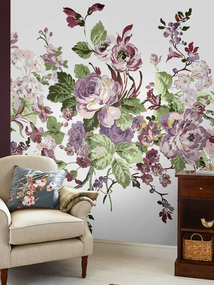 Dette slående blomstertrykket er karismatisk og pent, inspirert av et malt antikt kunstverk som oppbevares i Laura Ashley-arkivet. Rosemore-designet innlemmer tradisjonelle britiske blomster og frukter, som roser og jordbær, noe som gir et herlig preg av klassisk landlig sjarm. Veggmaleriene måler 3 m brede x 2,8 m høye og kommer på én rull med seks referansepaneler. Alle Laura Ashley-tapeter er trykt i Storbritannia og limes på veggen. Bare lim dem på veggen, heng opp tapetet og la det tørke. Hver rull er 17 m lang og 50 cm bred.