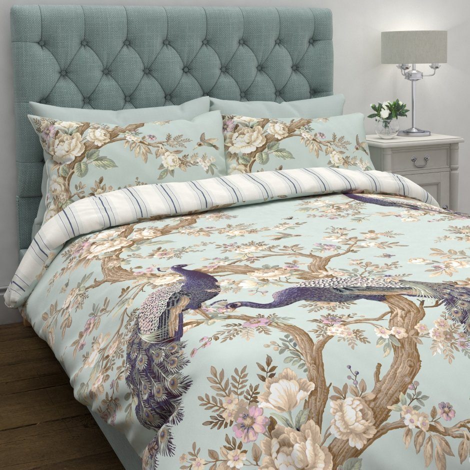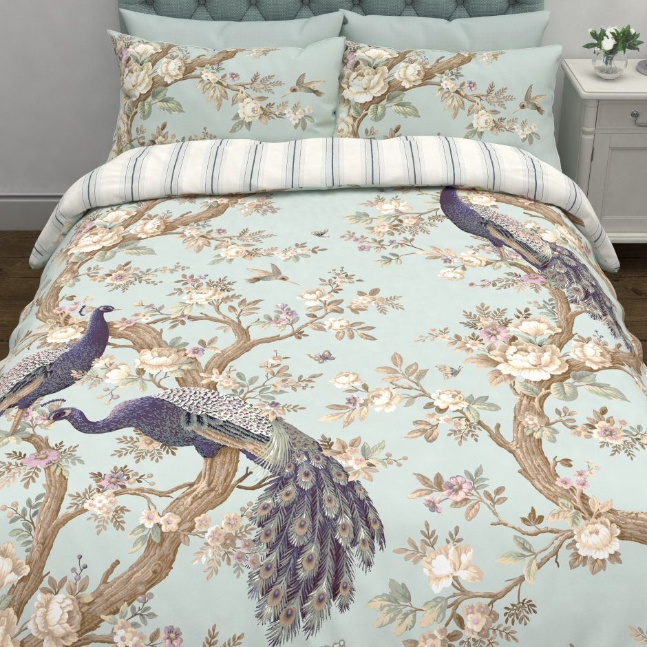Et sengesett med mønster av påfugler, vil gi et rikt og spennende inntrykk på soverommet, bomullssatengen vil i tillegg gi deg en myk og deilig opplevelse før du sovner.