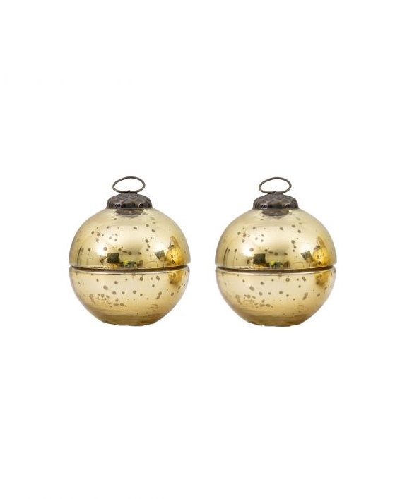Et elegant og dekorativt sett med 2 gull julekuler i glass med stearinlys, løft opp lokket og tenn lyset, skinnet vil tilføre sjarm og hygge til rommet.