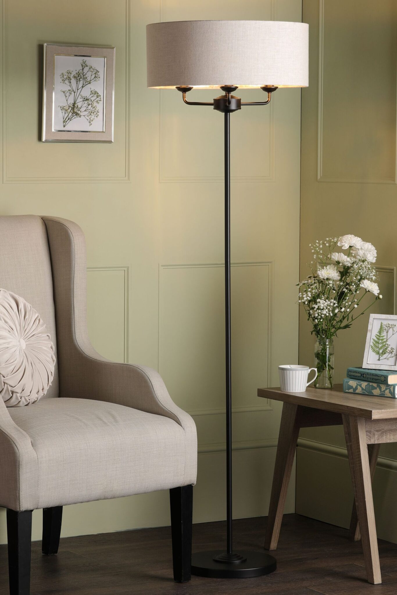 En elegant og sofistikert stålampe i industriell sort med naturfarget skjerm. Det er en stilren og lekker stålampe med 3 lyspunkter, som vil gi et elegant og klassisk uttrykk til rommet.
