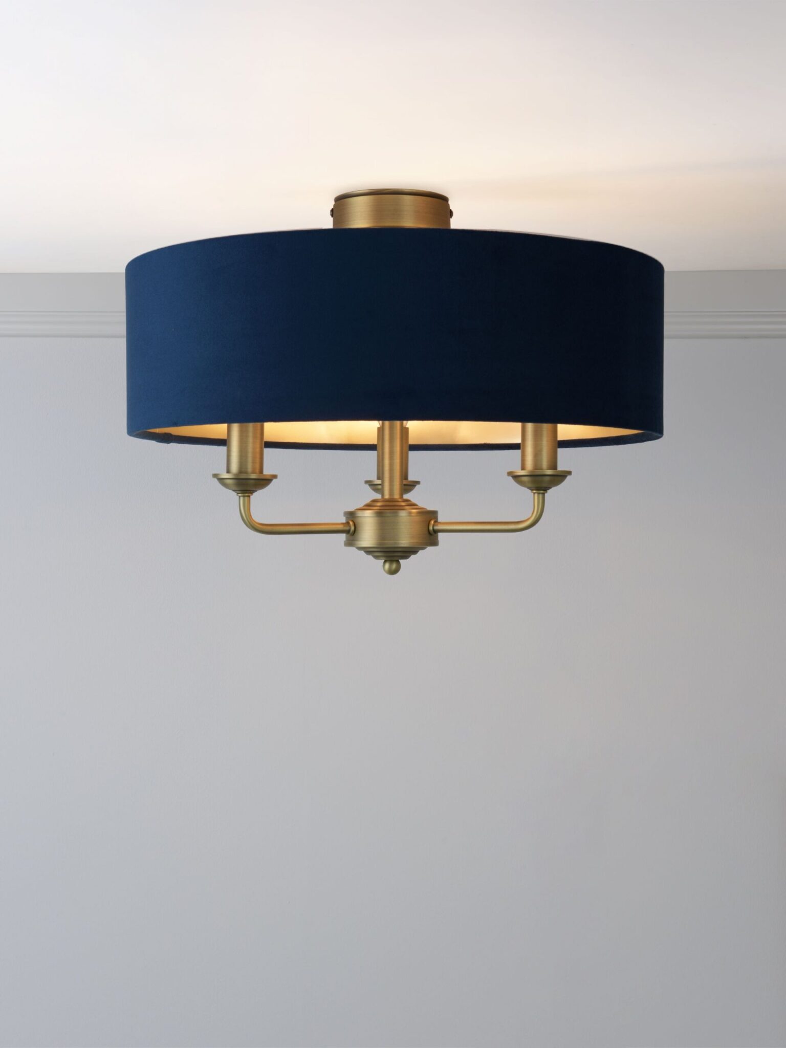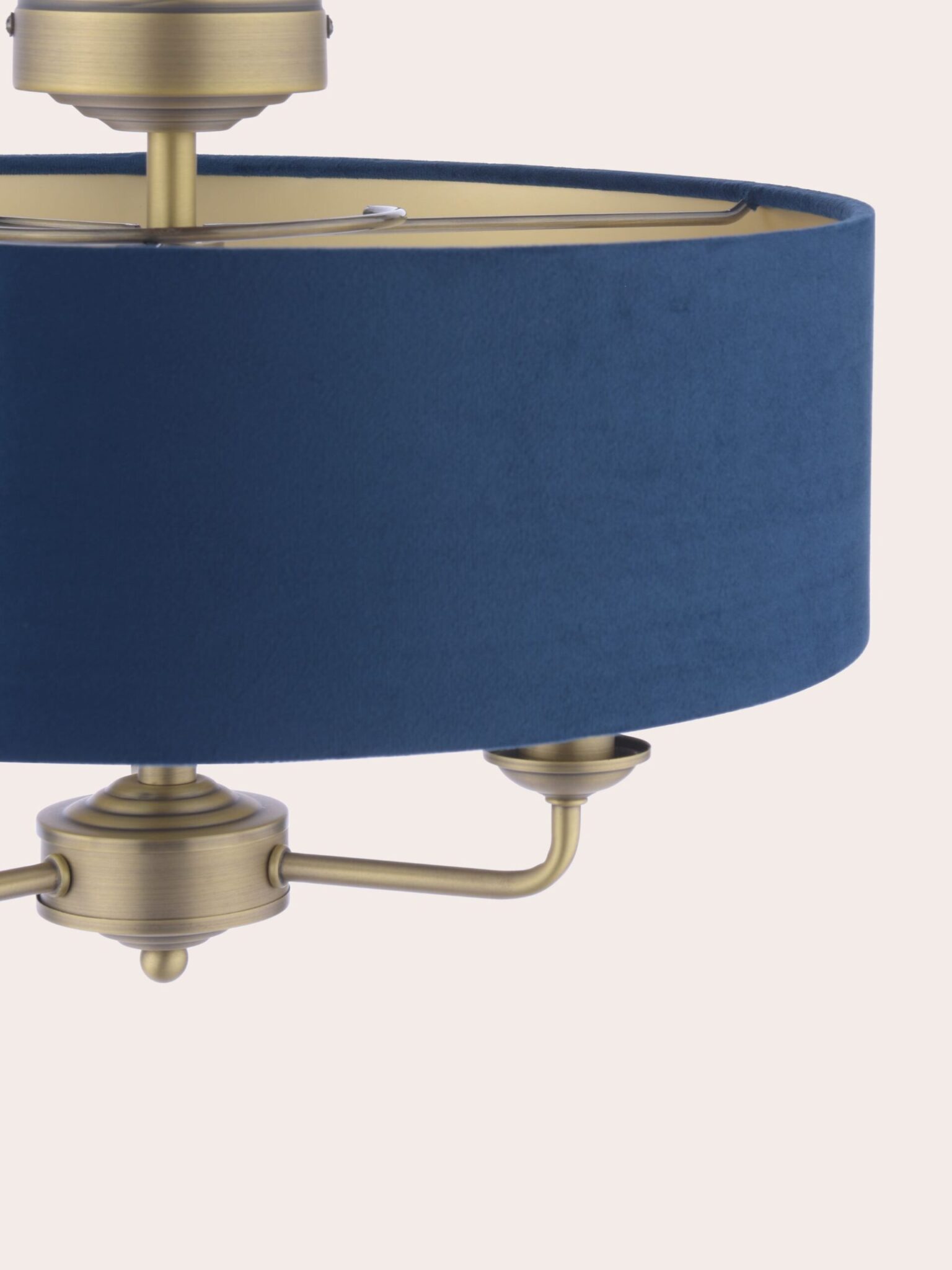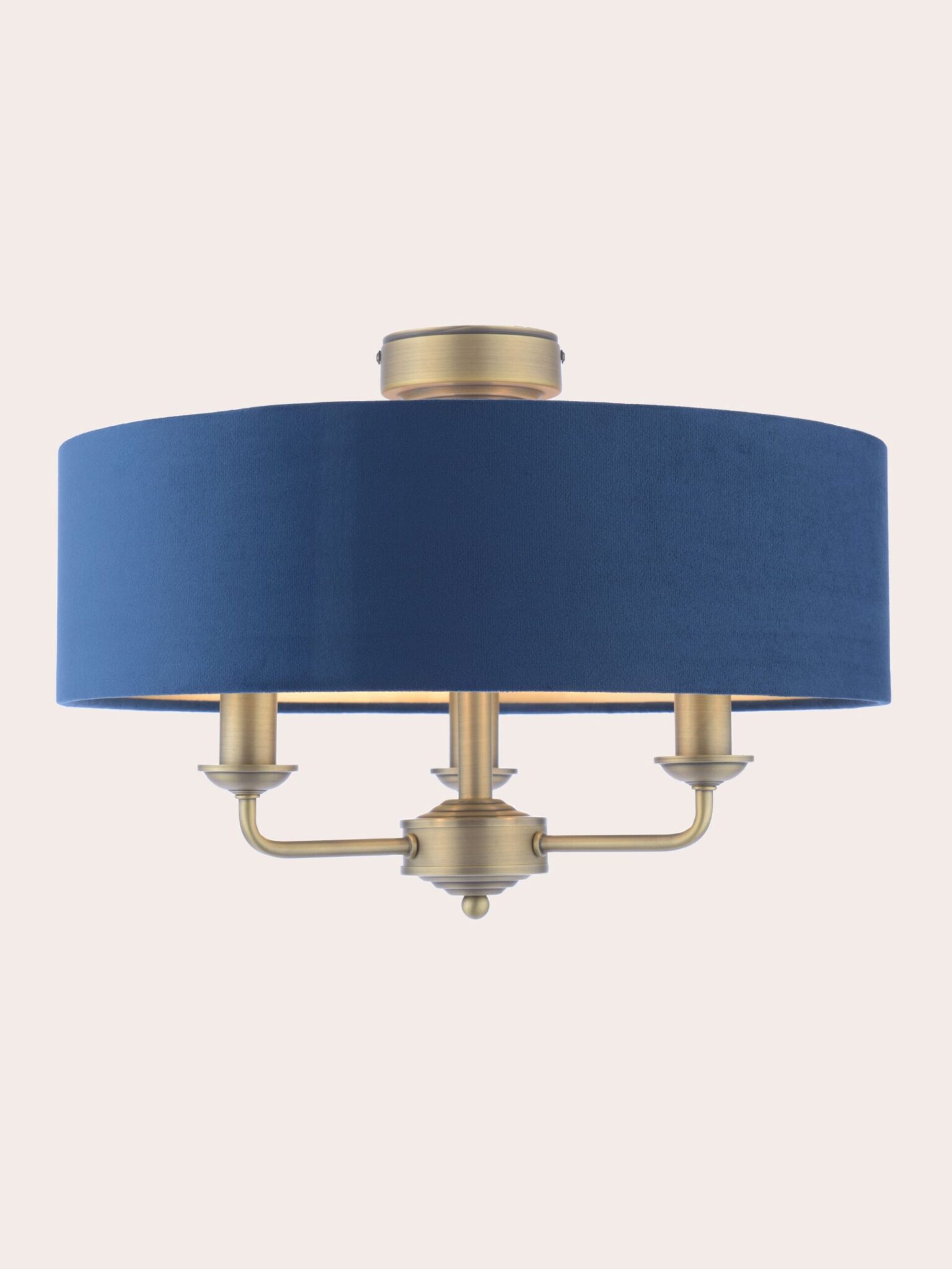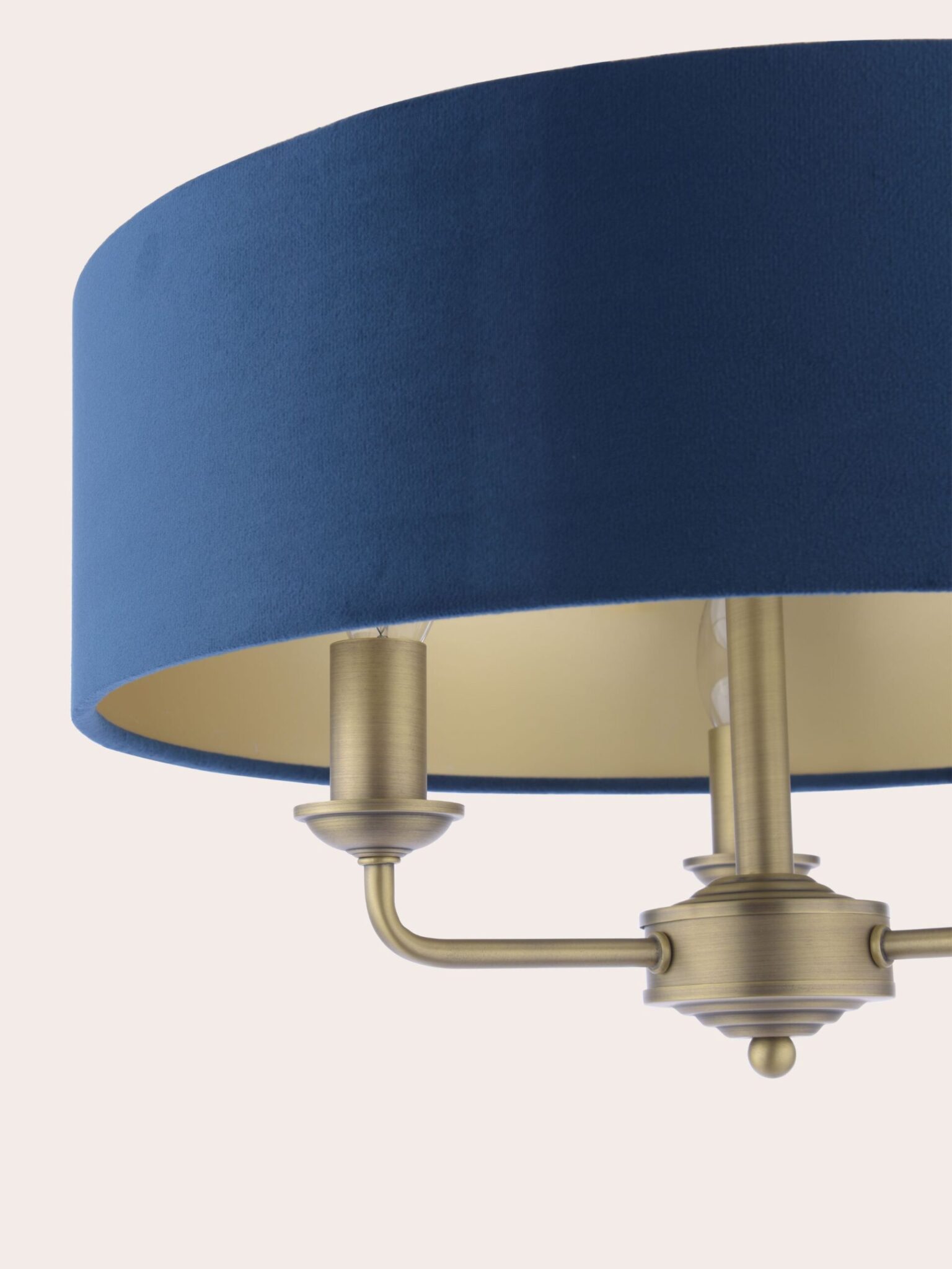 En elegant og sofistikert takplafond i antikk messing med blå fløyelsskjerm fra Laura Ashley. Det er en stilren og lekker plafond med 3 lyspunkter, som vil gi et elegant og klassisk uttrykk til rommet.