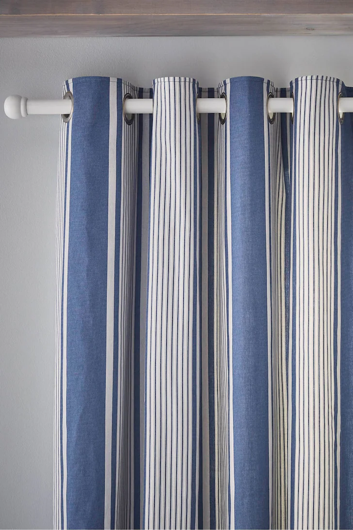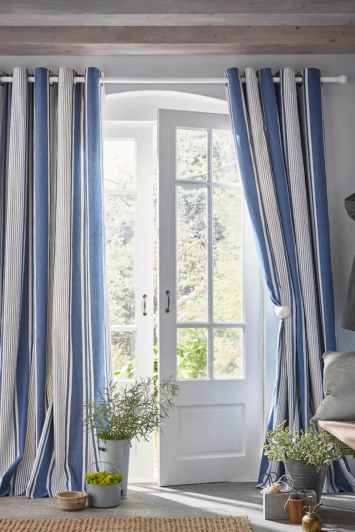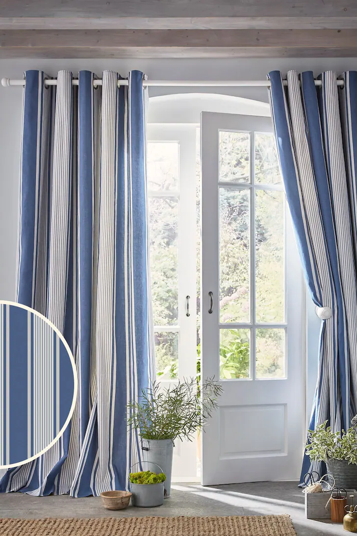 Tiverton Stripe er en ferdigsydd gardin med maljer i 100% bomull. Gardinen har en landlig stil med et diskré trykk i denim utsende. Tiverton Stripe vil heve ethvert hjem eller hytte.