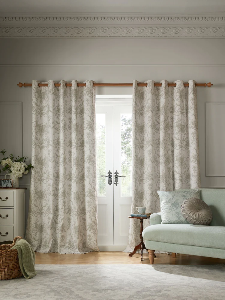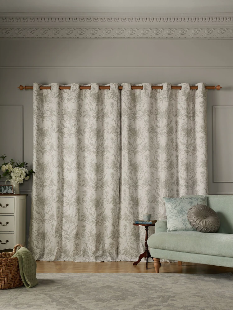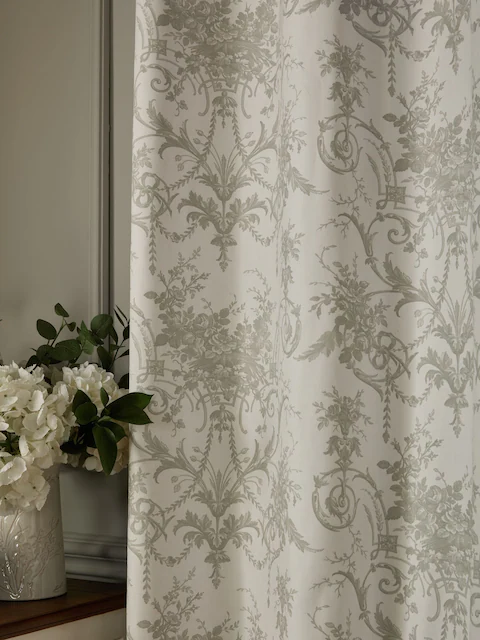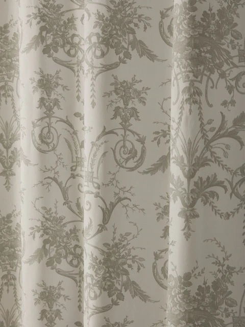 Tuileries, ferdigsydde gardiner i due grått. Det lekre designet er inspirert av en antikk «Toile de Jouy» stil fra Laura Ashley sitt arkiv, det ekstravagante mønsteret er romantisk og har en fransk eleganse.