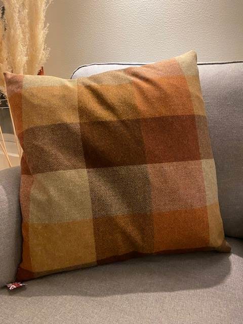 Delikat ullpute i deilige orangetoner, de brune stripene i denne rutete ullen gjør dette til en lun og lekker pute.