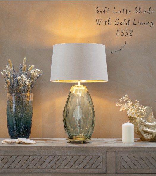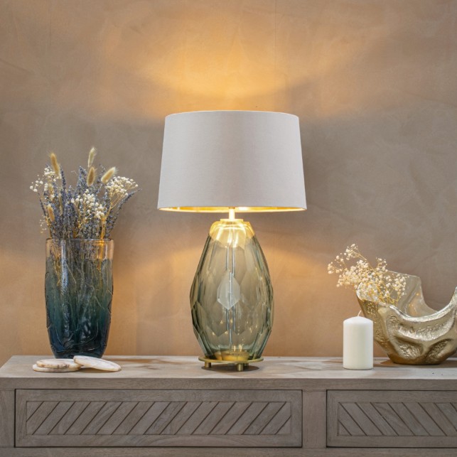 Vivian bordlampefot kombinerer røkt grønt glass med en polert gullfarget base og skaper et sofistikert og moderne uttrykk. Den dype, dempede grønntonen gir lampen karakter og dybde, mens den varme gullbasen tilfører et elegant og eksklusivt preg.