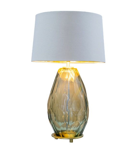 En moderne bordlampe i grønt glass som kombinerer farge, form og eleganse – ideell for stue, soverom eller entré.