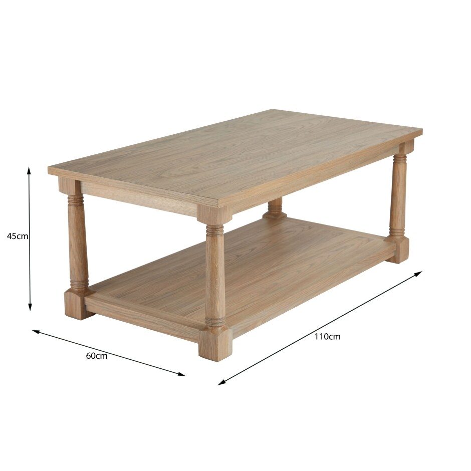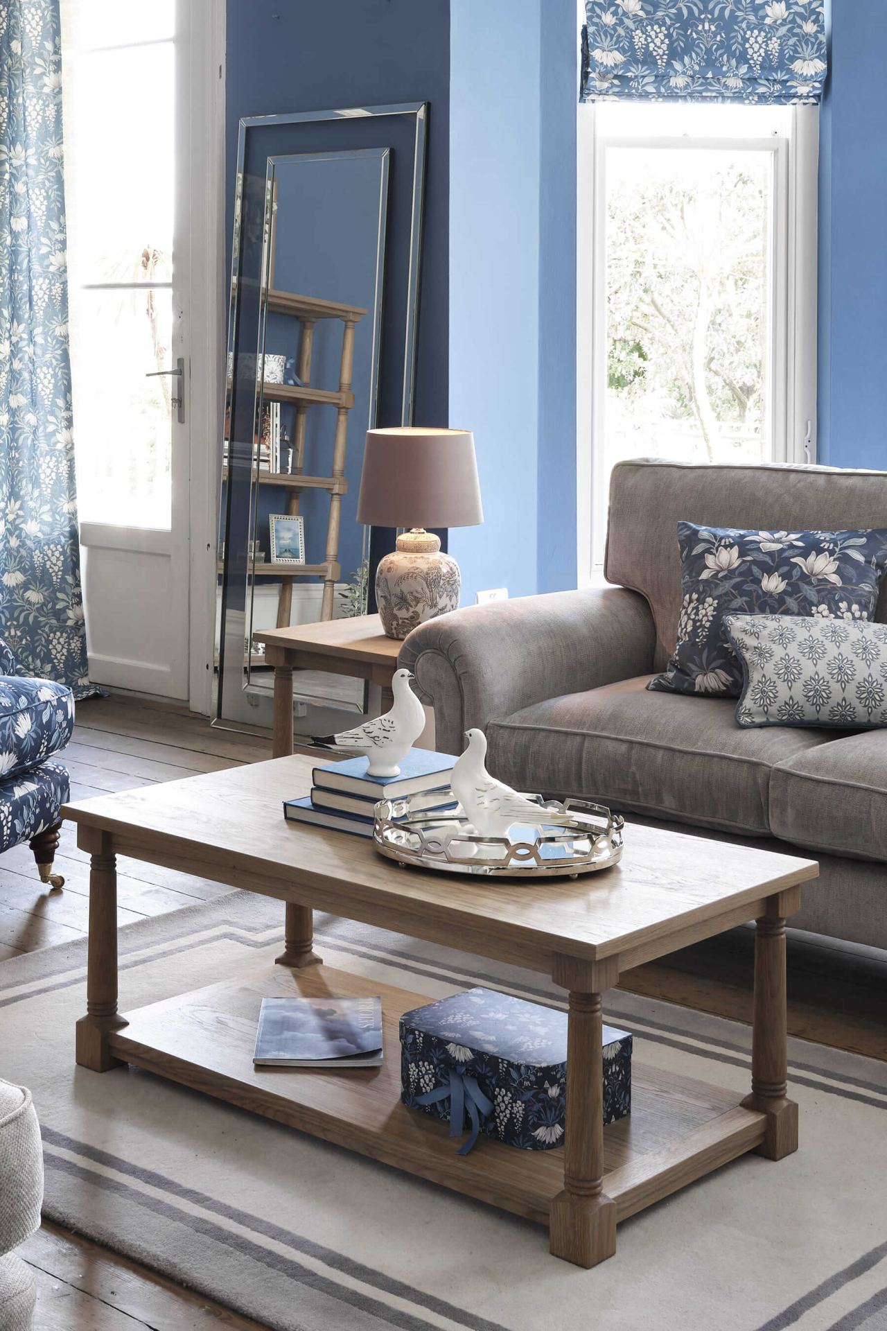 Wellington, en rustikk møbelserie i oljet og vokset eik/eikefiner, her som salongbord, med solide søyleben og enkle rustikke detaljer.
