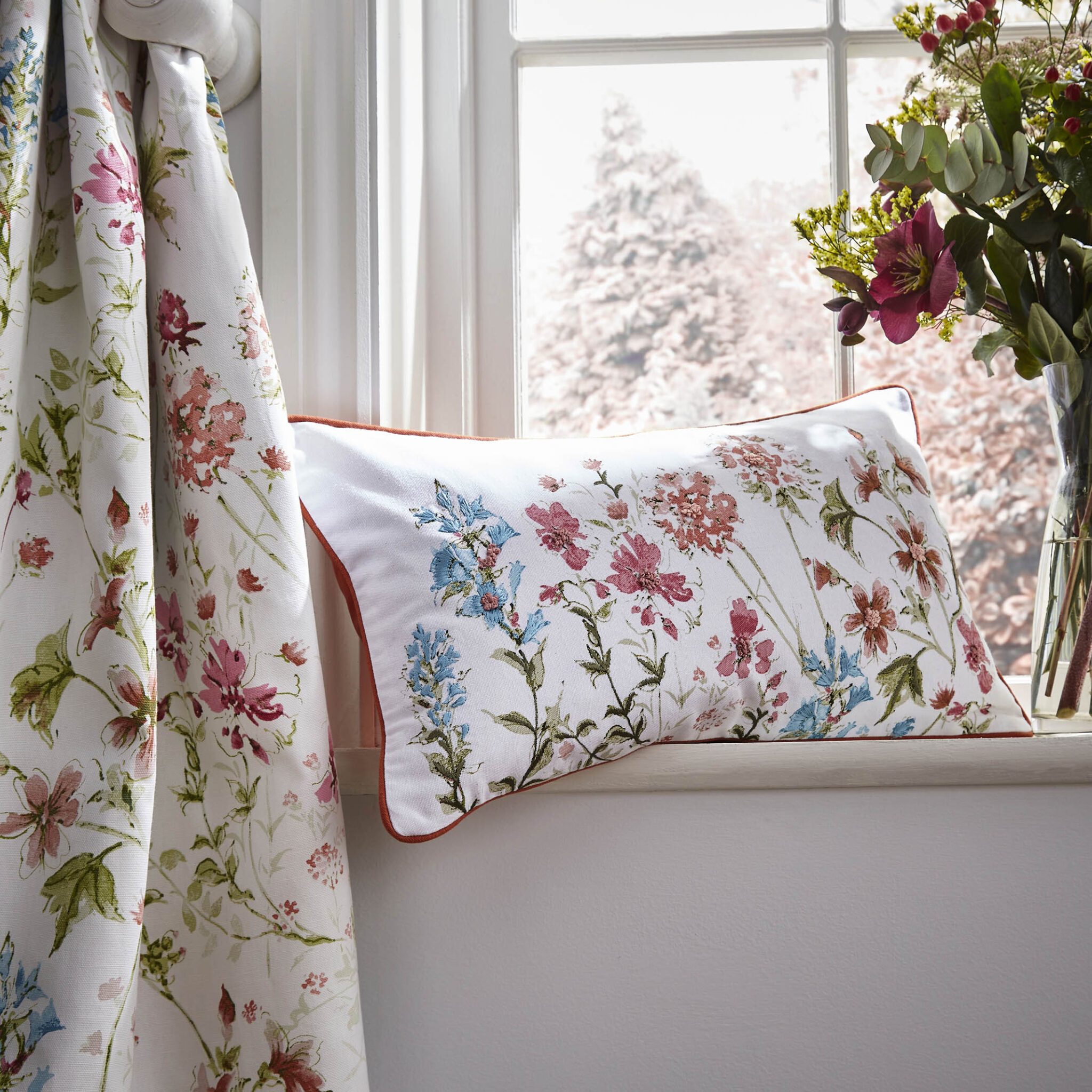Vårt vakre Wild Meadow mønster, med blomstereng kommer her som en lekker fargerik pute, med broderte detaljer.