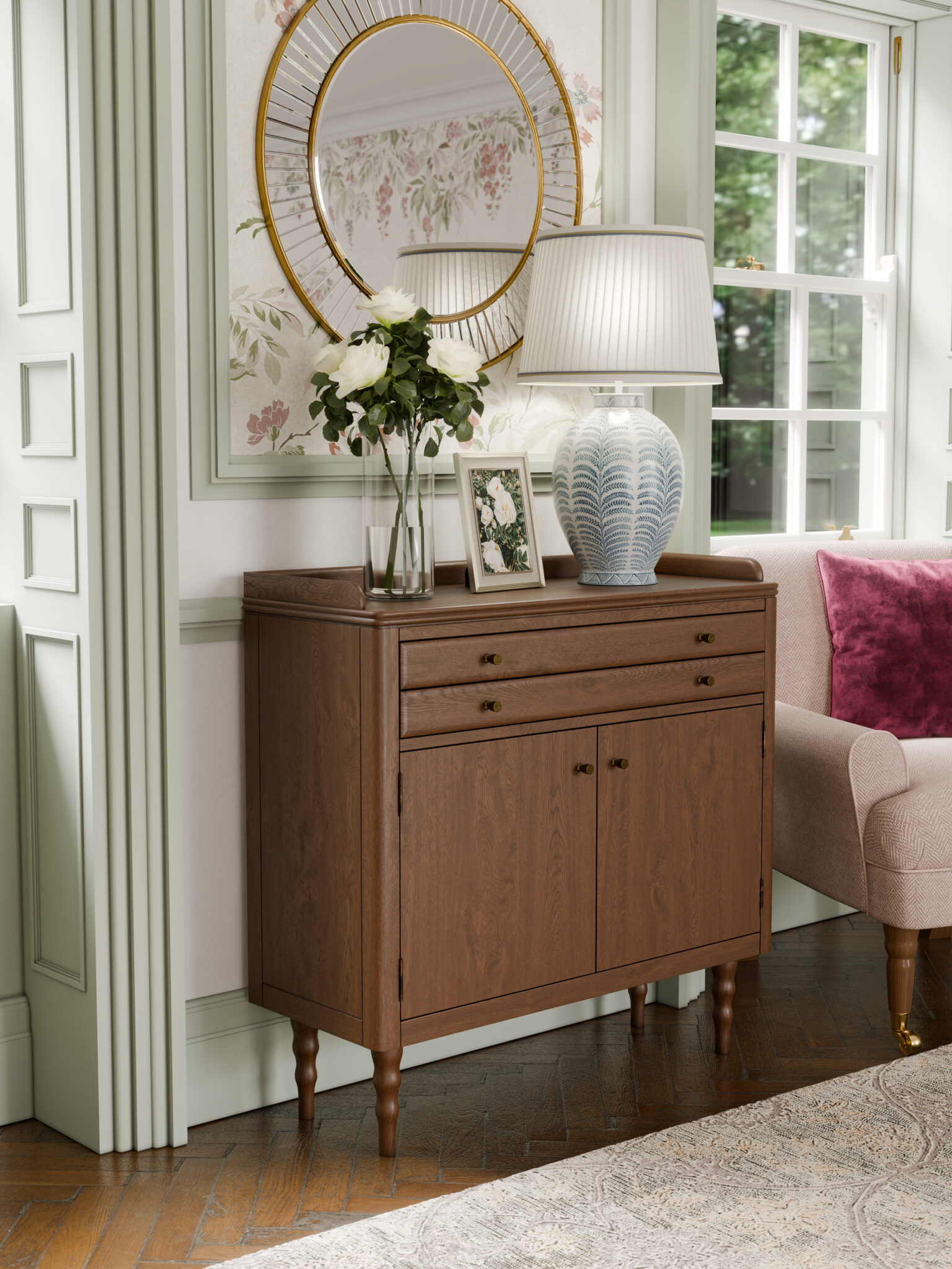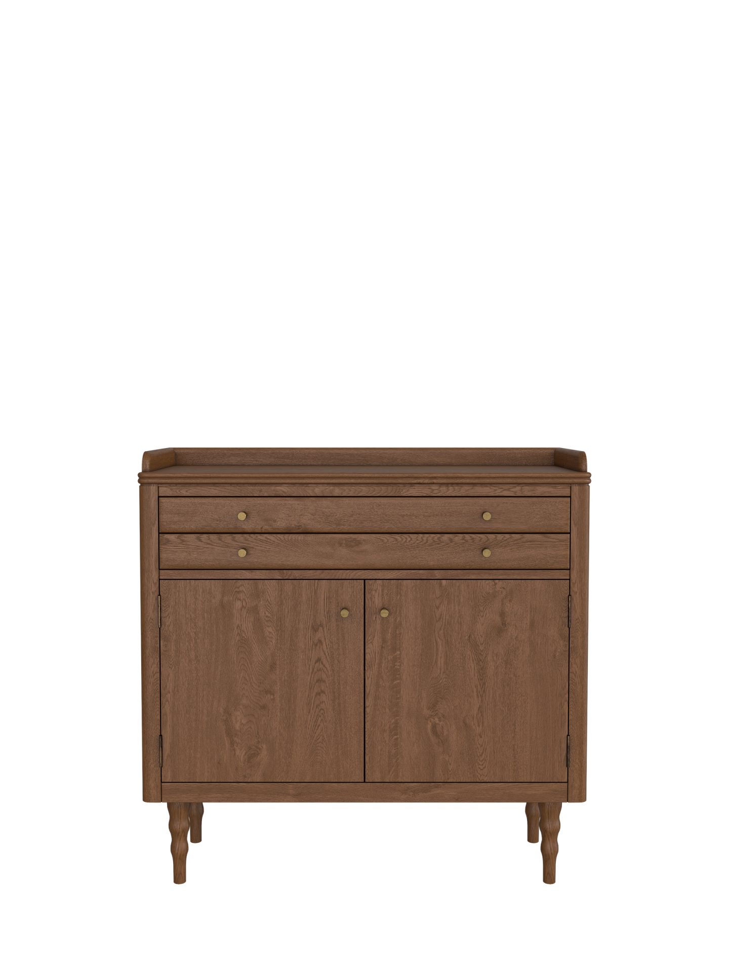 Williamson skjenk med 2 dører og 2 skuffer har et sofistikert og unikt design kombinert med en vakker finish. Dette kompakte oppbevaringsmøblet er laget av massivt almmateriale og finér, og har dreide ben i spoleform, en dobbel bullnose-kantprofil på toppen og en pent formet oppreist stand. To skråskårne skuffer er tradisjonelt montert på treskinner, mens dørene har tradisjonelle hengsler i antikk messing som matcher de elegante dør- og skuffeknottene. Det herlig figurformede treverket er fremhevet med en varm teak-effekt beis og en beskyttende satenglakk, noe som sikrer at investeringen din vil være et samtaleemne i årene som kommer. Bare bena trenger å festes for å begynne å nyte dette møbelet; full montering er ikke nødvendig.